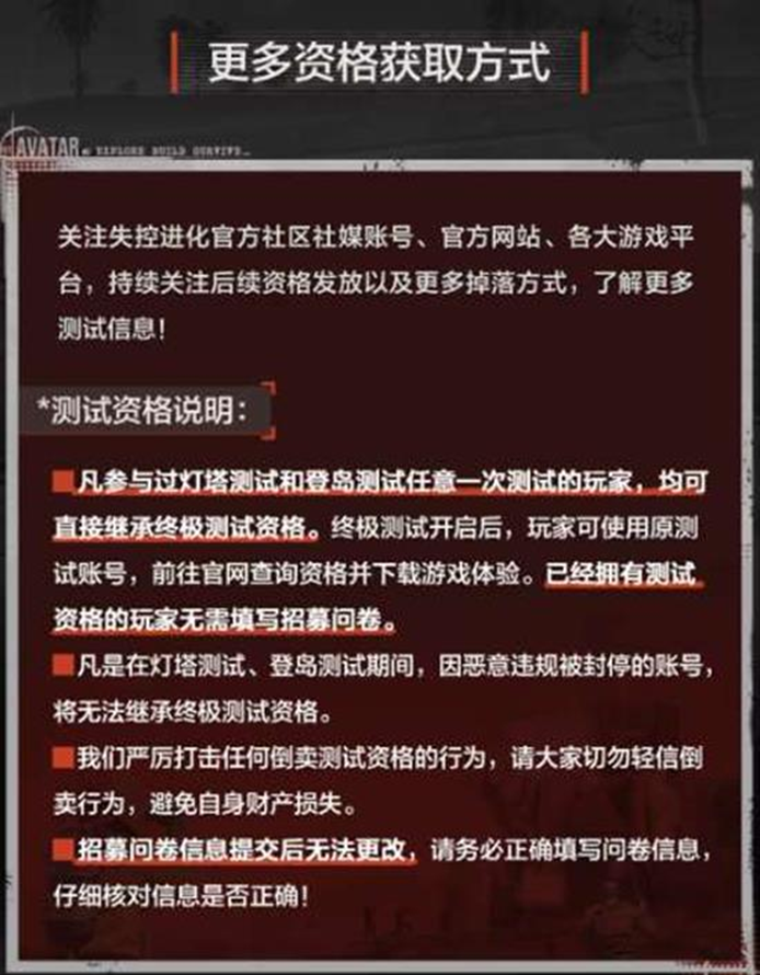 对于已经参与过灯塔测试和登岛测试的玩家,你们可以直接继承终极测试资格,无需再次填写招募问卷。但请注意,如果在之前的测试中因违规被封停账号,将无法继承资格。我们提醒所有玩家,不要轻信任何倒卖测试资格的行为,以免造成财产损失。