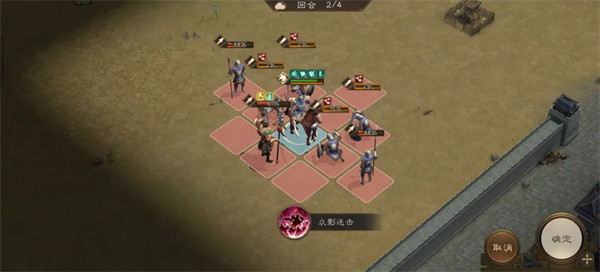 2、回合开始张辽前进到下图位置开技能奋强突固到敌军中央。敌军回合时会攻击张辽,张辽先打一轮反击降低敌人血线。