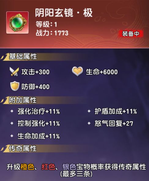 传奇属性:宝物的随机被动技能,橙色以上的宝物会出现传奇效果,一个宝物最多 3 条传奇属性。
