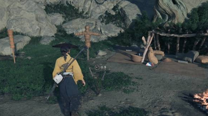 跟着半兵卫走到训练场,拾取场地中间的刀和他训练。