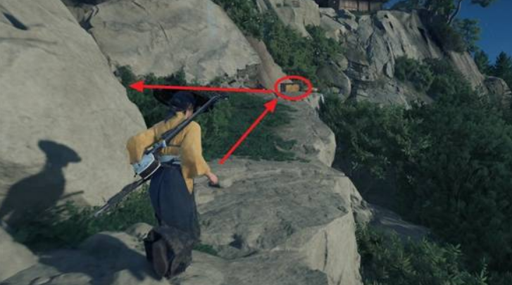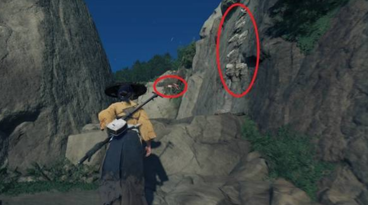 墙上带有白色印记的石头可攀附,远处带有红色丝带的树枝可用钩爪直接跳过去。