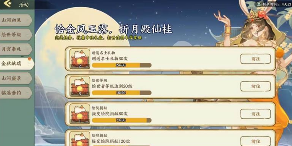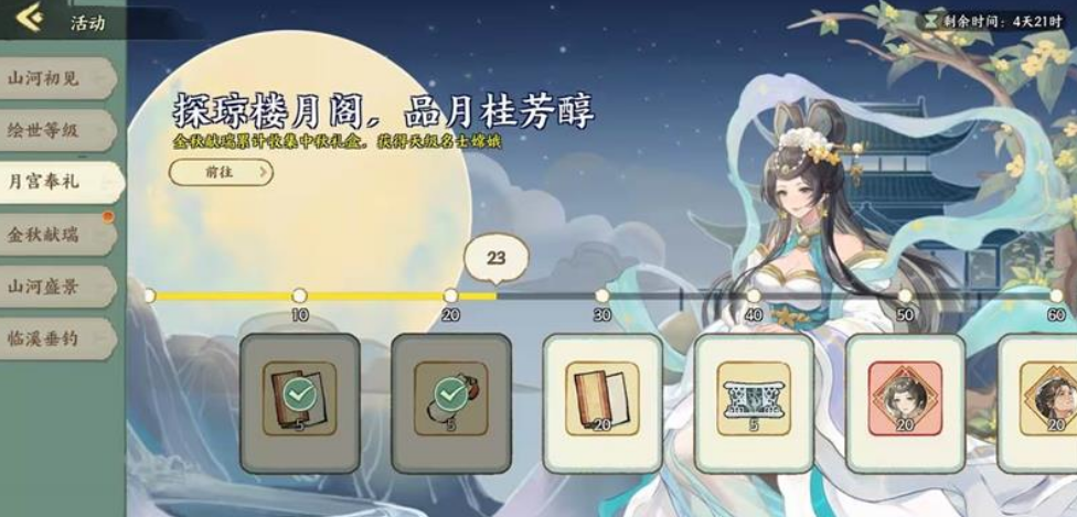 【金秋献瑞】活动累计获得[中秋礼盒],开启后即可获得指名拜帖、文物、强力两仪系名士「李白」以及天级名士「嫦娥」等多重好礼