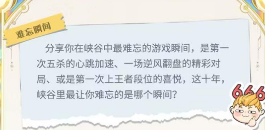 5.王者荣耀十周年,不仅是游戏的庆典,也是所有玩家共同的回忆。让我们一起参与“我的峡谷纪念册”活动,分享那些年我们一起走过的峡谷时光,记录下属于我们的王者荣耀故事。