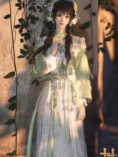 全新套装「惜芳时」的设计灵感来源于王维的诗句:“坐看苍苔色,欲上人衣来。”这套衣服以铁线莲的温柔蔓延为主题,翠叶层叠,花散清芬,仿佛将一个个煮茶听风的午后和推窗见山的清晨都融入其中。