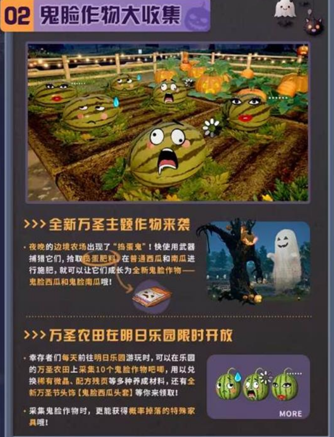 幸存者们每天前往明日乐园游玩时,可以在乐园的万圣农田上采集10个鬼脸作物吧唧,用以兑换稀有微晶、配方残页等多种养成材料,还有全新万圣节头饰【鬼脸西瓜头套】等你来领取!采集鬼脸作物时,更能获得概率掉落的特殊家具哦!