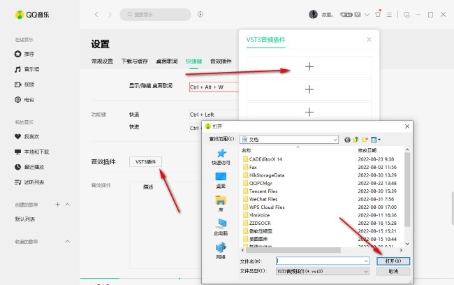也可以点击"音效插件"一栏中的"VST3插件"按钮,在给出的窗口页面中,点击"+"按钮进行添加就可以了。