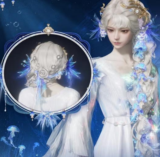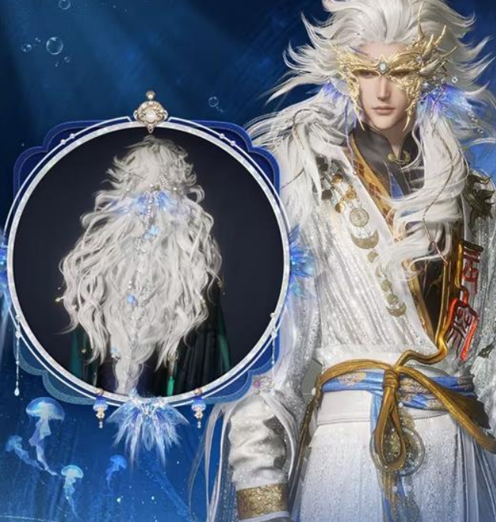鲛人泪珠缀于鬓边,映着海月莹辉闪烁。发间幽蓝水母如深海星火,随潮汐明灭,与海浪同频。男款发型搭配面饰,女款发型搭配发饰,皆有水母特效配饰,仿佛将一片神秘的海洋世界戴在了头上。