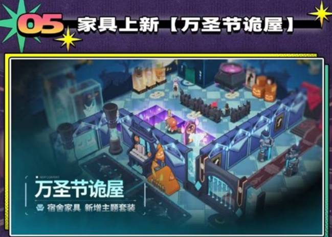 为了庆祝万圣节,家具商店将上架全新【万圣节诡屋】主题家具,为玩家的宿舍增添节日氛围。