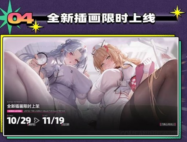 全新插画【抚心问诊】也将于10月29日维护后至11月19日2:59期间限时上架,玩家可以通过【万物交易所】-【图册交易区】购买获取。