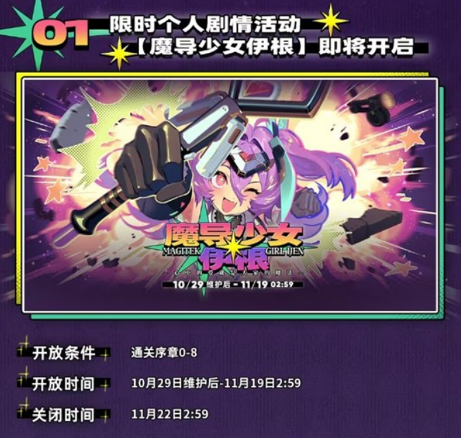《交错战线》即将在新版本中带来一系列精彩活动,其中最受关注的莫过于限时个人剧情活动魔导少女伊根。这一次的活动将于10月29日维护后至11月19日 2:59期间开放,玩家通关序章0-8即可参与!