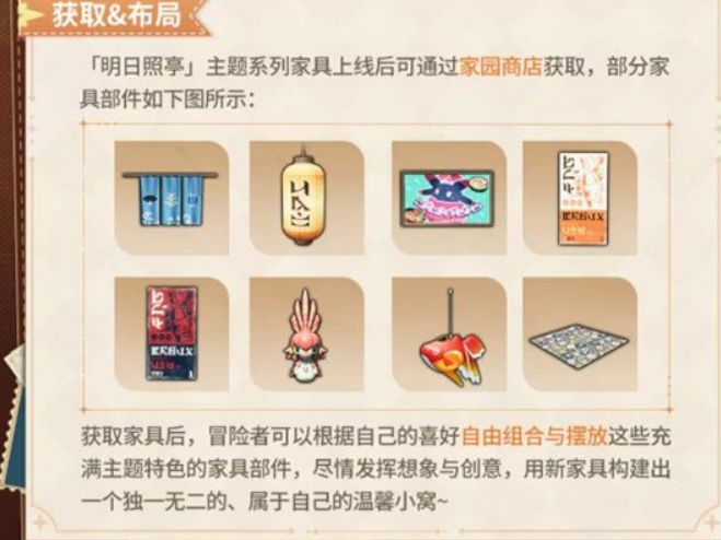 冒险者可以通过家园商店获取「明日照亭」主题系列家具。获取家具后,冒险者可以根据自己的喜好自由组合与摆放这些充满主题特色的家具部件,尽情发挥想象与创意。