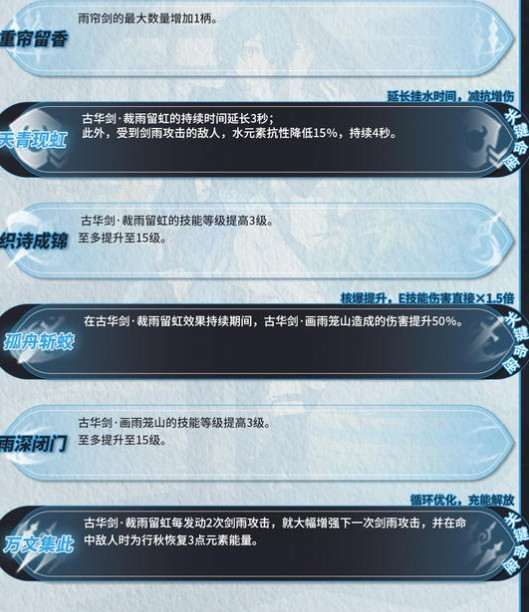 天青现虹:古华剑·裁雨留虹的持续时间延长3秒;此外,受到剑雨攻击的敌人,水元素抗性降低15%,持续4秒。