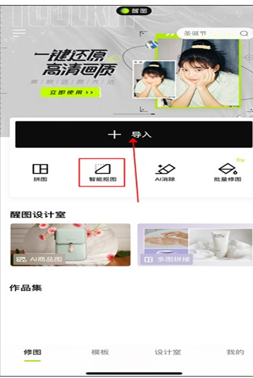 打开醒图app,进入到用户界面,可以直接点击页面上方的“智能抠图”选项进行抠图,但如果想在编辑图片的过程中抠图就可以点击页面上方的“导入”按钮;