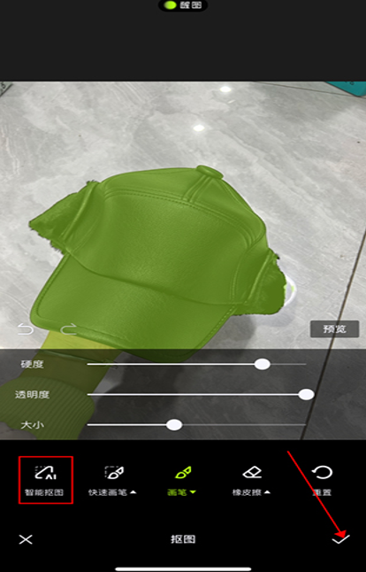 进入到抠图页面,可以选择画笔手动抠图,也可以点击“智能抠图”按钮来抠图,等待几秒后可以看到抠出来的图像已经被选中了,再点击页面右下角的“勾号”按钮;