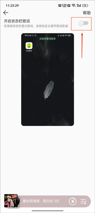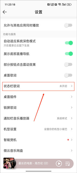 之后你会看到【开启状态栏歌词】的开关。默认是关闭的,开启即可