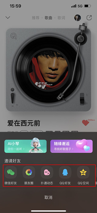 然后就会弹出邀请好友界面,页面中有很多种邀请方式,选择一种自己想要的方式邀请,等待好友点击进入了你分享的链接就可以一起听歌了;