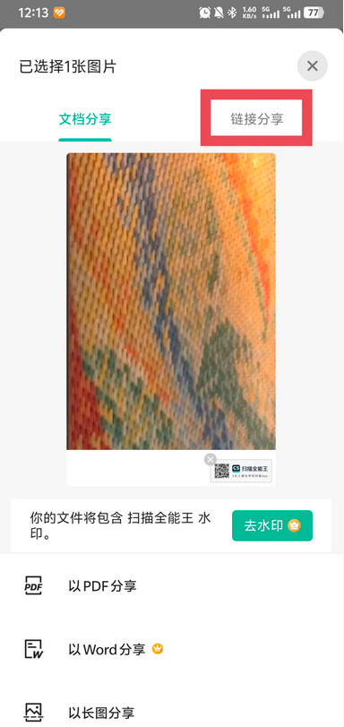 选择链接分享: 在“文档分享”界面,你会看到“去水印”功能有 会员锁。不用管它! 选择 “链接分享” 方式。