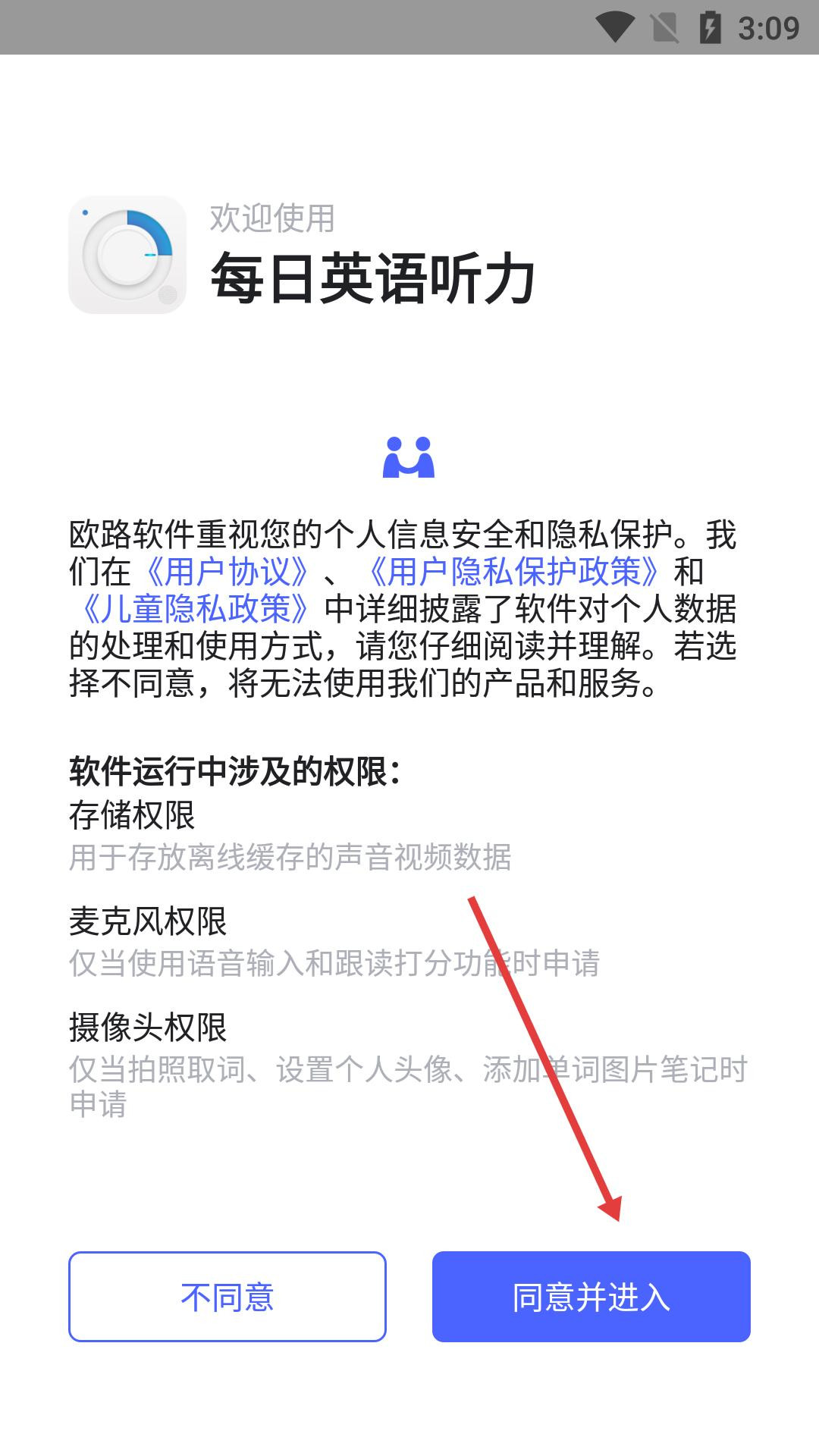 2、需在用户协议和隐私政策界面点击同意,接受相关条款后才能进入应用。