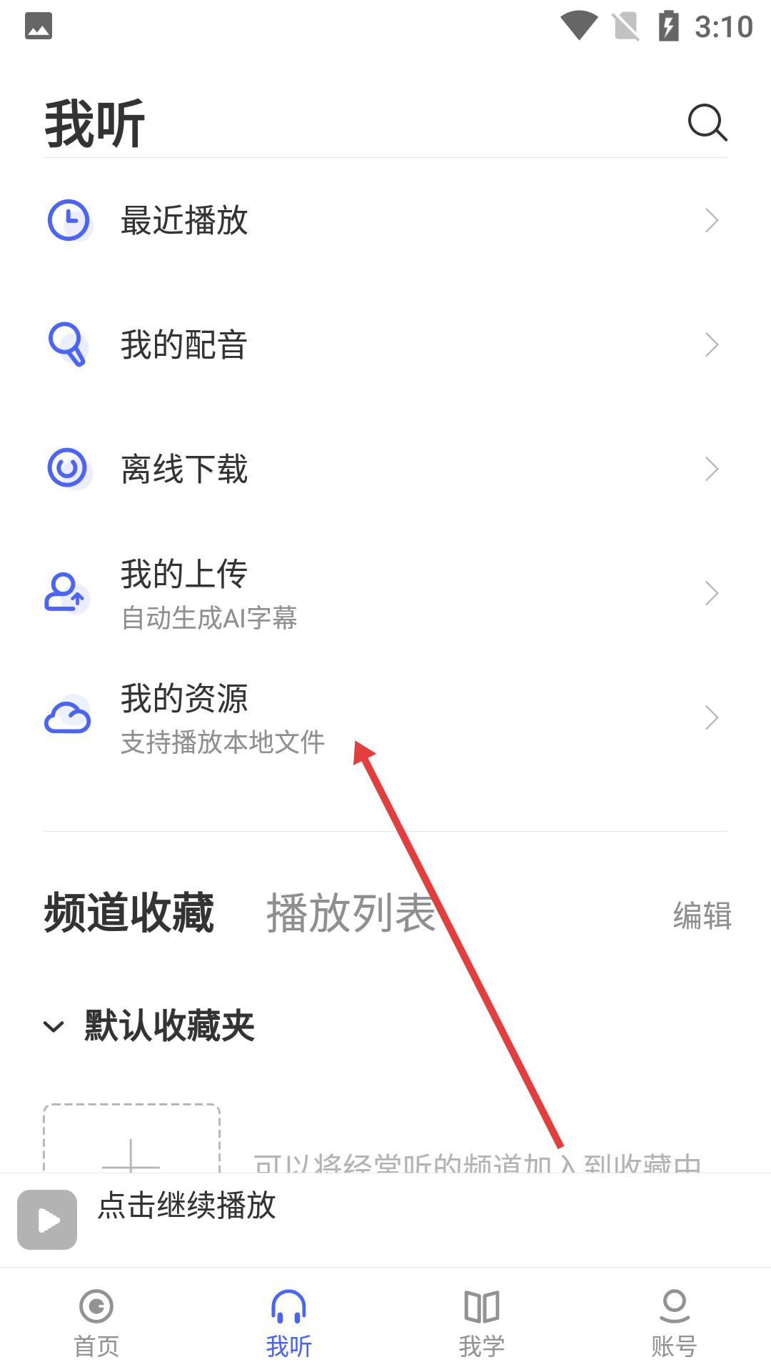 4、进入每日英语听力APP我听页面,可查看最近播放、我的配音等内容,还能管理离线下载及个人上传等资源。
