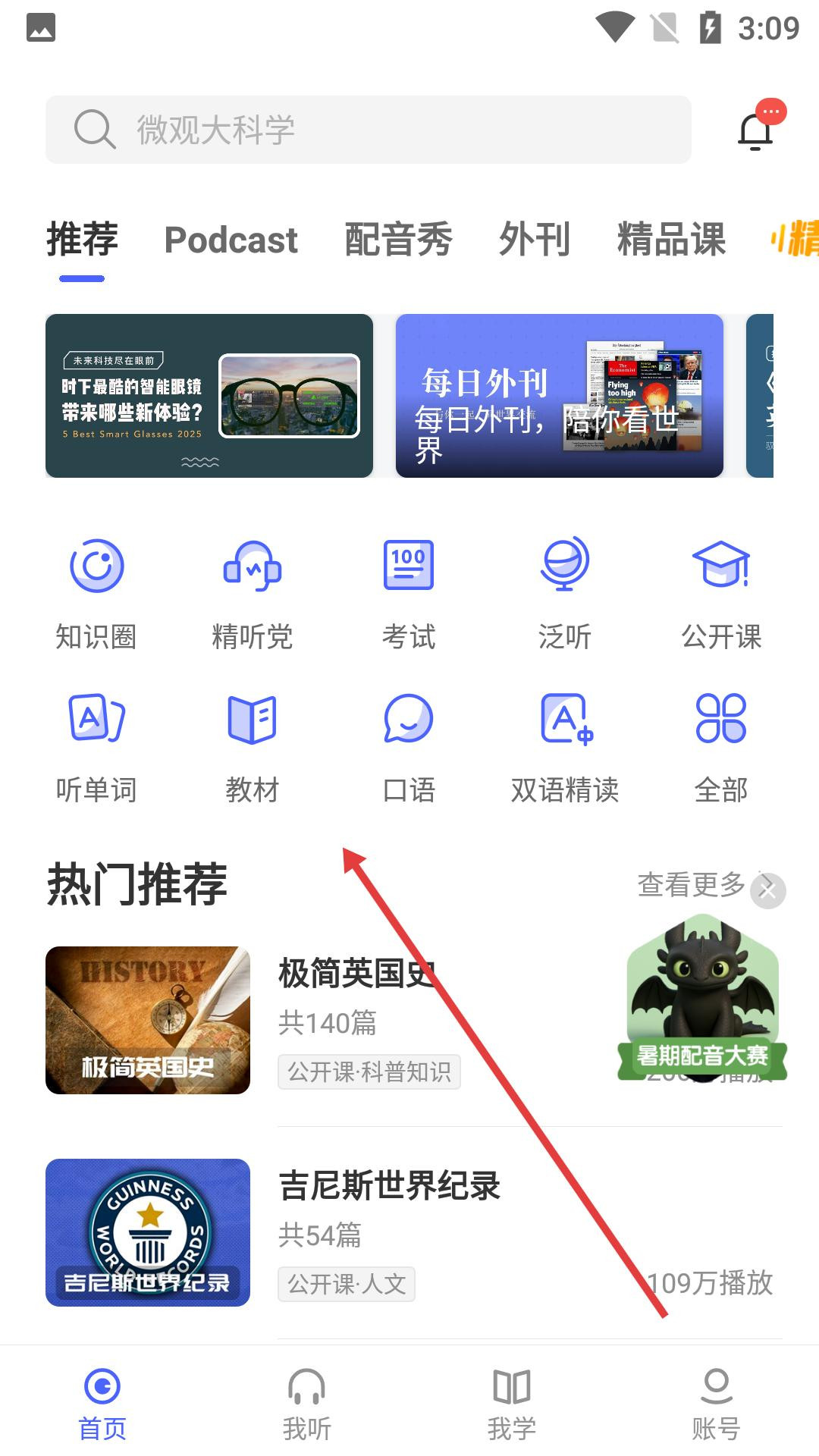 3、在每日英语听力APP首页,设有知识圈、精听党等多种功能入口,还有热门推荐内容,满足用户多样的英语学习需求。
