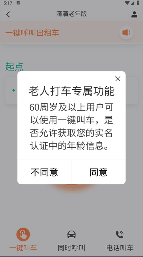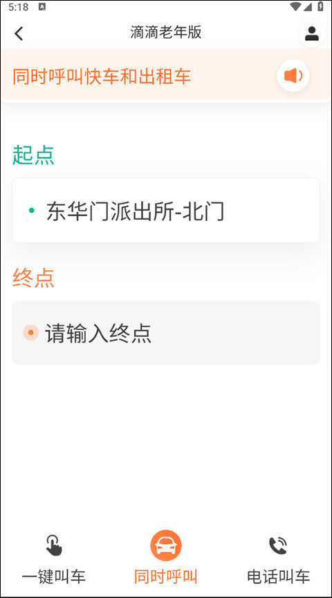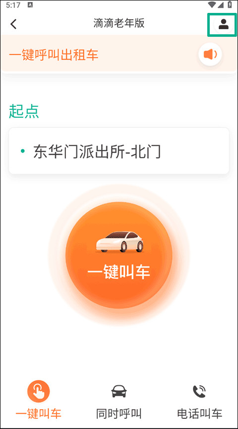 1、首先,打开滴滴出行老人打车app,可以在一键叫车界面中找到并点击中间的“一键叫车”选项;