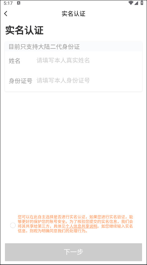 3、接下来就是在实名认证中输入你的真实姓名和身份证号、点亮橙色字体的选项栏、点击下一步即可开始叫车服务;