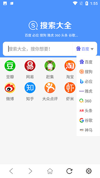 3、软件首页拥有百度、搜狗、必应等多种搜索引擎,用户可以随意切换。