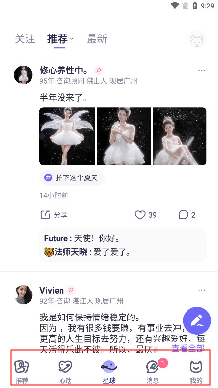 6、app分为推荐、心动、星球、消息、我的,五大板块,欢迎来体验。