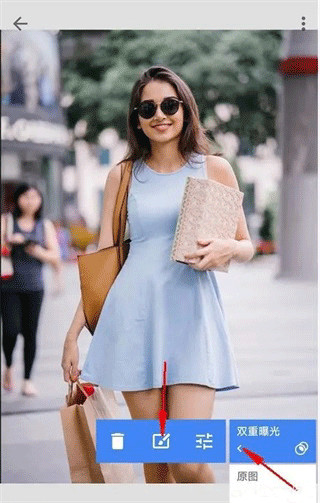 3、进入双重曝光工具后,点击+号添加一张我们要换背景的图片,如下图所示。添加图片后,食指和大拇指控制图片,对图片进行拖动、放大缩小,让我们要扣的人物与背景重合在比较合适理想的位置。
