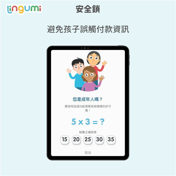 儿童区设计方便让孩子自行操作,所以设定帐号、付款资讯,更多资讯都会在家长区。从儿童区切换到家长区,我们设计了一个乘法的安全锁,每次切换时都需要输入正确的乘法结果,才能成功进入家长区,避免孩子误触付款资讯或是修改到学习的帐号。