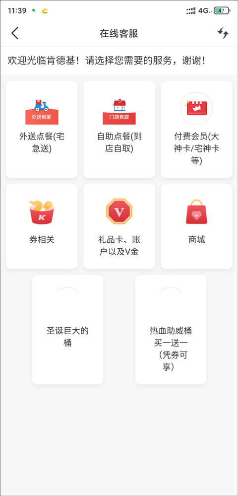 3、也可点击在线客服选项,点击上面的外送点餐选项。