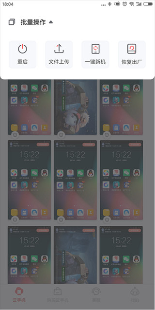 1、首先,点击顶部的“批量操作”按钮,呼出云手机的批量管控功能栏,选择相应的群控功能,即可进入相应的功能应用操作界。