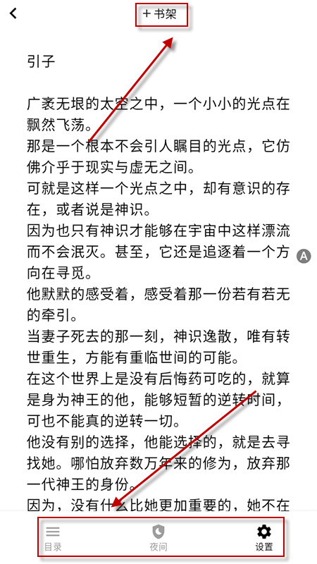 5.书架管理:阅读时点击“+书架”,将小说加入书架,后续可在“书架”页面直接找到该小说。