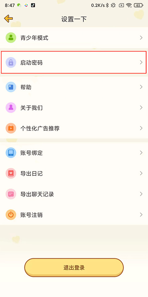 在设置中找到“启动密码”,点击进入进行密码管理操作。