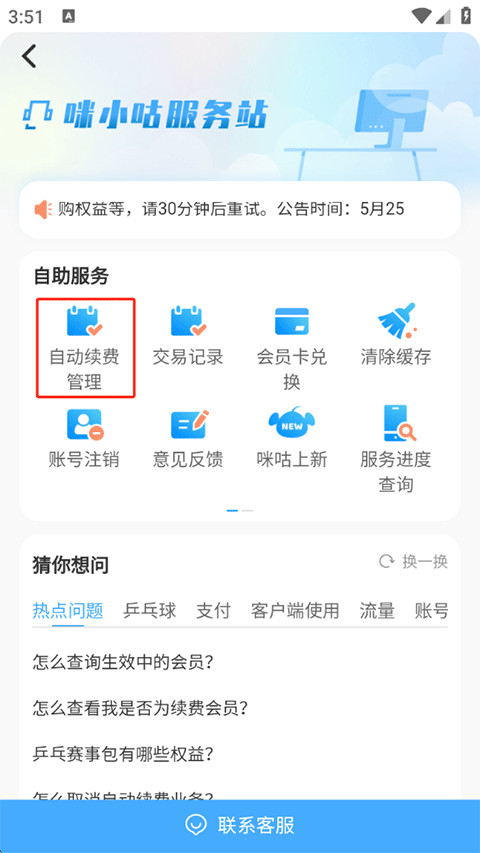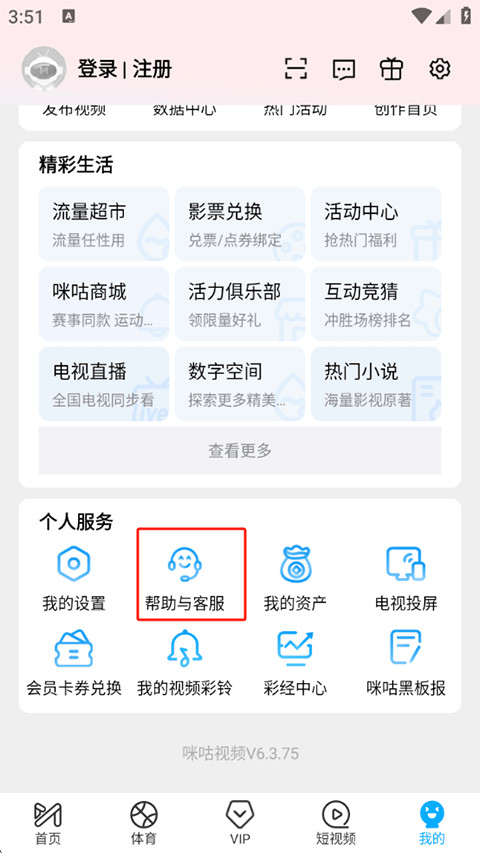 打开咪咕视频后进入帮助与客服页面,找到自助服务入口。