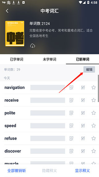 5、在已斩单词里找到要恢复的单词,点击右上方编辑