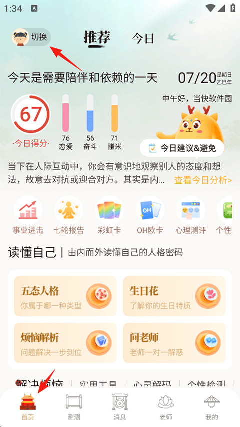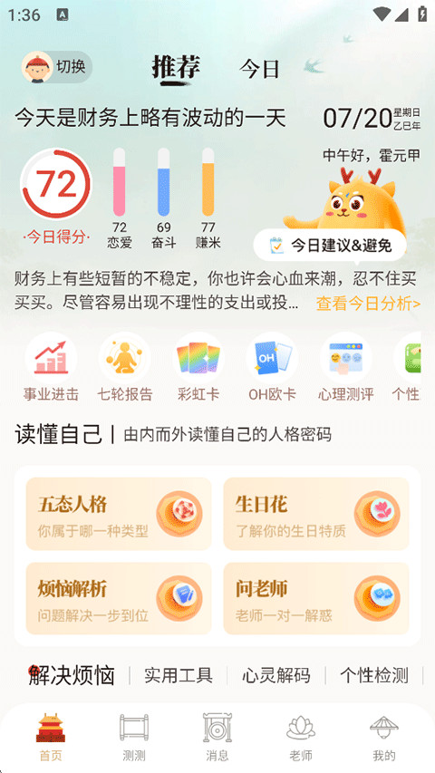 5、接着就可以在首页的推荐页查看您的个人运势和一些其他命运测试工具了。