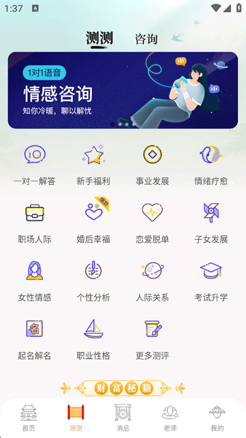 7、在测测功能页系统提供了众多生活情感工具,等你来体验。