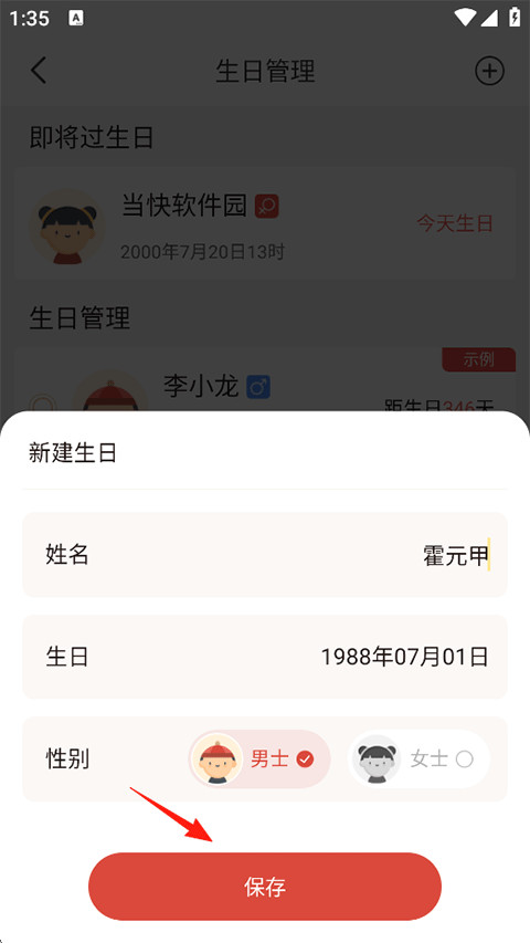 4、填写个人信息如:姓名、生日以及性别,完成后点击保存。