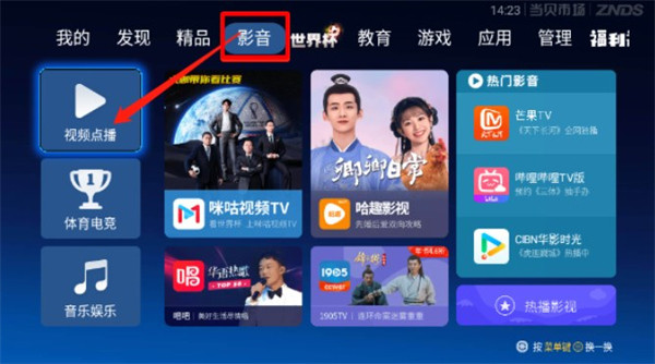 1、找到并点击影音栏目,然后选择视频点播。