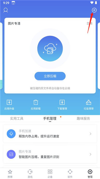2、进入管理界面之后,点击屏幕右上角的设置按钮。