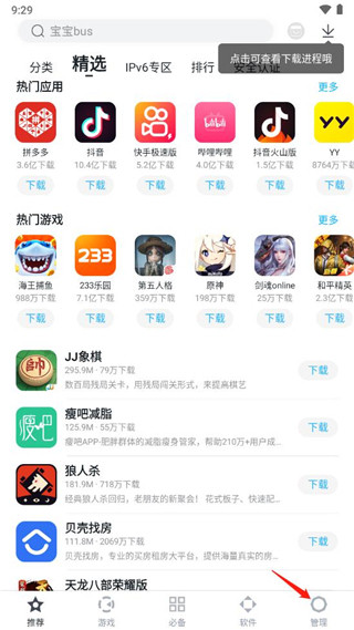 1、进入百度手机助手APP的首页之后,点击页面右下角的“管理”。