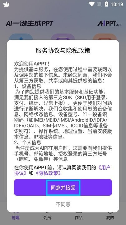在北仑手游网下载打开ai制作ppt模板,阅读弹出的服务协议与隐私政策,点击【同意并接受】;