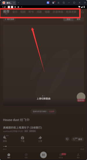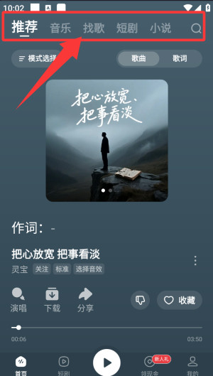 2、在主界面选择音乐板块或通过搜索找到想听的歌曲所有歌曲均可免费畅听无时长限制过程中会累积收益。