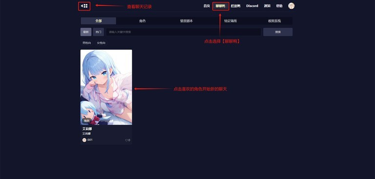 1、点击聊聊鸭,可以选择喜欢的角色开始新的聊天,要是想查看聊天记录,还能点按照下图所示,点击框出位置查看聊天记录
