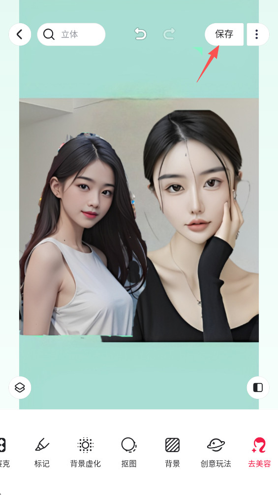 8、随后就可以看到抠出来的图片到了另一张图中,调整完毕后,点击屏幕右上方的“保存”。