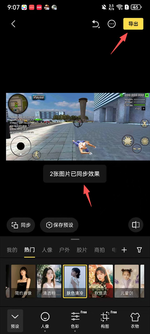 6、还可以进行滤镜,人物修图等操作,随后点击屏幕右上方的“导出”即可。