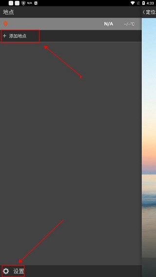 滑动界面左侧,可以在这里的“添加地点”,了解你感兴趣的国家和地区天气变化,同样在这里还有设置功能,点击即可进入系统设置。