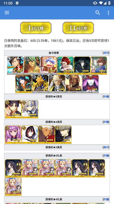 4、在模拟抽卡界面中你可以直接点击1回和11回召唤进行抽卡,也可以在输入你自己的预算来模拟抽卡