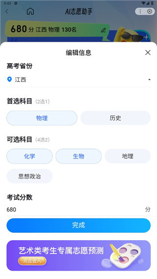 3、然后我们需要填写我们考试所在省份、需要查询的考试科目、估计分数,点击【完成】;
